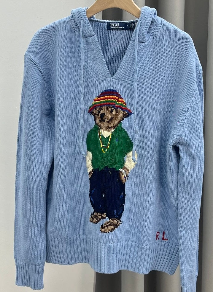 Polo Bear intarsia-knit and embroidered on the front. "RL" cross-stitched on the left hem.